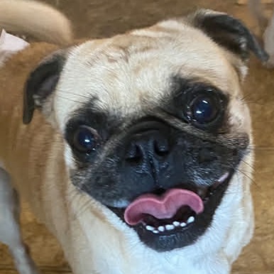 Milo is a happy 2+ yo fawn male pug with a big toothy grin. He was found as a stray in Hondo. Like all pugs, he is quite food oriented, which accounts for his slightly chonky waistline. Whoever owned Milo previously, did not bother with housebreaking, so currently, it is a work in progress. Belly bands, potty pads, and a regular feeding/walking schedule are being utilized. Milo loves all humans, female dogs, & is fine with cats. However, he views himself as huge, dominant dog, so will challenge other male dogs- even those several times his size. Are you ready to welcome this snorty, energetic guy into your home & heart?