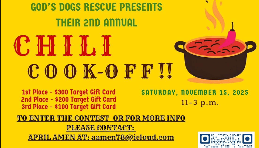 Join us for our first annual chili cook-off! Hurry to register your delicious chili in the contest NOW or you can email April at aamen78@icloud.com for more information.